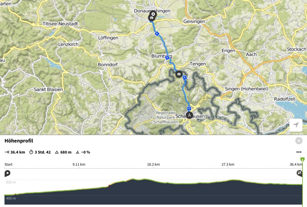 Doch bald sind wir am Kulminationspunkt und werden durch die ruhige schöne Landschaft und die rassige Abfahrt nach Blumberg entschädigt. Noch einige „ups“ and „downs“ und das Tagesziel Donaueschingen ist erreicht. Das schwäbische Nachtessen im Biergarten mit gegrillter Haxe war „s Tüpfli uf em i“.